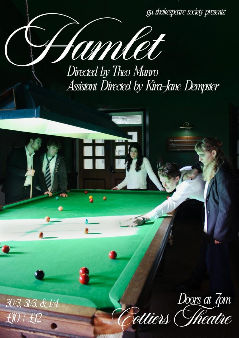 The Glasgow University Shakespeare Society proudly presents their 2026 spring production of ‘HAMLET’ by William Shakespeare, directed by Theo Munro and assistant directed by Kira-Jane Dempster